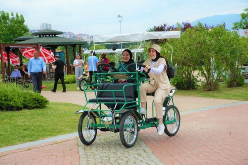 Samsun Büyükşehir Belediyesi'nin Batı Park Yürüyüş Yolu'nda hizmete sunduğu 4 kişi kapasiteli aile bisikleti, vatandaşlardan büyük ilgi gördü.