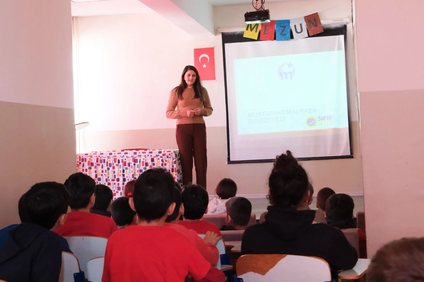 Mustafakemalpaşa Belediyesi Çevre Mühendisi verilen uygulamalı ve interaktif eğitimde öğrencilere atığın kaynağında ayrıştırılması, atık türleri, geri dönüşümün önemi, sıfır atık projesi, iklim değişikliği tanımı, iklim değişikliği ile mücadelede alınacak önlemler ve çocuklara çevre konusunda bilinçlendirme yapıldı.