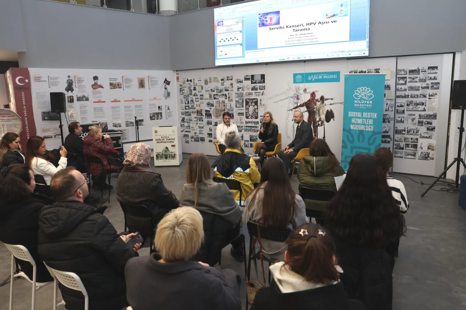 Nilüfer Belediyesi Dr. Ceyhun İrgil Sağlık Müzesi’nde moderatörlüğünü Bursa Uludağ Üniversitesi (BUÜ) Aile Hekimliği Ana Bilim Dalı Öğretim Üyesi Prof. Dr. Yeşim Afşar Uncu’nun yaptığı söyleşide, BUÜ Kadın Hastalıkları Jinekolojik Onkoloji Cerrahisi Bilim Dalı öğretim üyeleri Prof. Dr. Kemal Özerkan ve Doç. Dr. Yakup Yalçın konuk oldu.