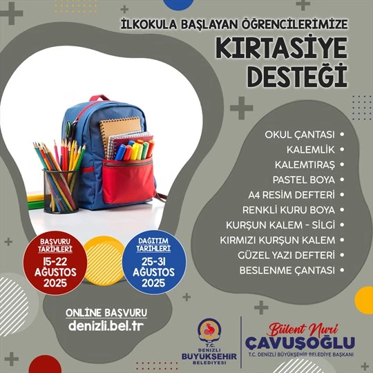 Bu yıl ilk kez sıralarına oturacak çocuklar için hazırlanan yardım setlerinde çanta, kalemlik, beslenme çantası, resim defteri, kuru boya, pastel boya, kalem, silgi, kalemtıraş, kırmızı kalem ve güzel yazı defteri yer alıyor. Denizli Büyükşehir Belediyesi, hem çocukların heyecanına ortak olacak, hem de ailelerin eğitim masraflarına katkıda bulunacak. Başvurular 15-22 Ağustos 2025 tarihleri arasında yalnızca https://denizli.bel.tr/basvurular adresinden yapılabilecek. Eksiksiz ve doğru bilgilerle tamamlanan başvurular değerlendirmeye alınacak.