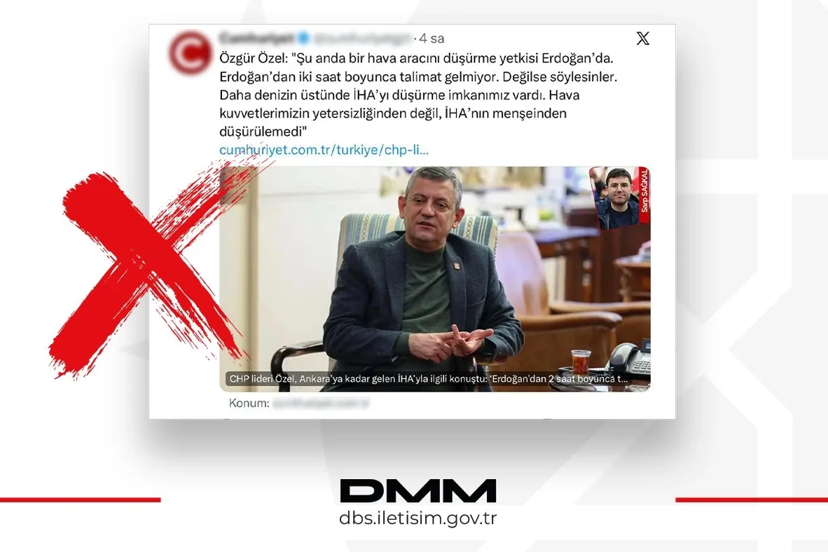 ANKARA (İGFA) - Dezenformasyonla Mücadele Merkezi, 15 Aralık’ta Karadeniz yönünden hava sahamıza yaklaşan bir insansız hava aracının (İHA) düşürülmesine ilişkin bazı basın yayın organlarında yer alan “Cumhurbaşkanlığı talimatıyla düşürüldü” iddialarını yalanladı.