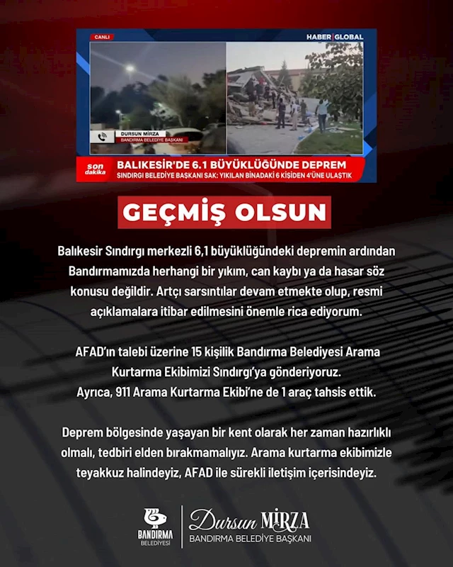 Balıkesir Sındırgı merkezli 6,1 büyüklüğündeki depremin ardından Bandırmamızda herhangi bir yıkım, can kaybı ya da hasar söz konusu değildir.