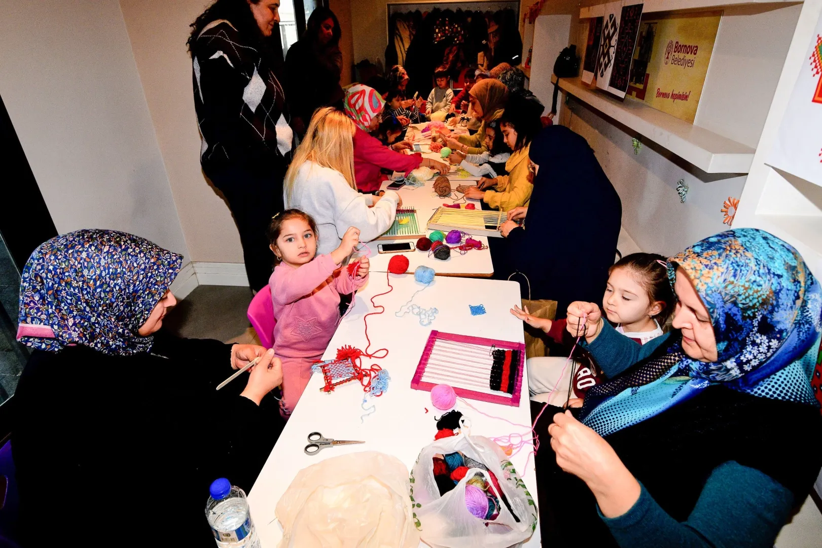 İzmir'de Bornova Belediyesi Çocuk Oyun ve Aktivite Merkezlerinde düzenlenen ebeveyn atölyeleri kapsamında, çocuklara yönelik dokuma atölyesi gerçekleştirildi. Minikler, ebeveynleriyle birlikte kilim dokuma çalışmaları yaparak hem el becerilerini geliştirdi hem de geleneksel dokuma sanatıyla tanıştı.