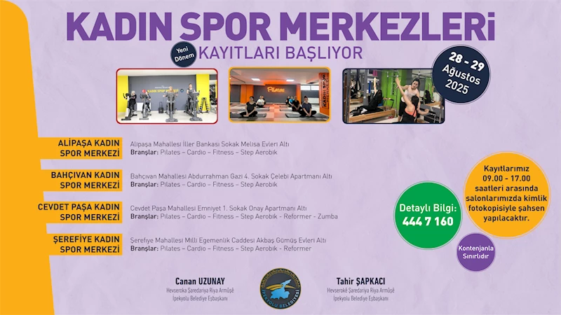 İpekyolu Belediyesi Gençlik ve Spor Müdürlüğü’ne bağlı Kadın Spor Merkezlerinde yeni dönem için kayıt süreci başlıyor. Kadınlara yönelik tamamen ücretsiz hizmet sunan merkezler, fiziksel ve ruhsal sağlığı desteklemek amacıyla yeniden faaliyetlerine başlıyor.