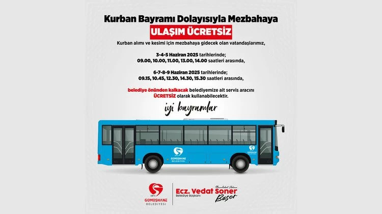 Gümüşhane Belediyesi, vatandaşların hayvan pazarına ulaşımını kolaylaştırmak amacıyla ücretsiz servis hizmeti sunarken, Kurban Bayramı süresince bayram ziyaretlerinin daha rahat gerçekleştirilebilmesi için toplu taşıma araçlarının da ücretsiz olacağını duyurdu.