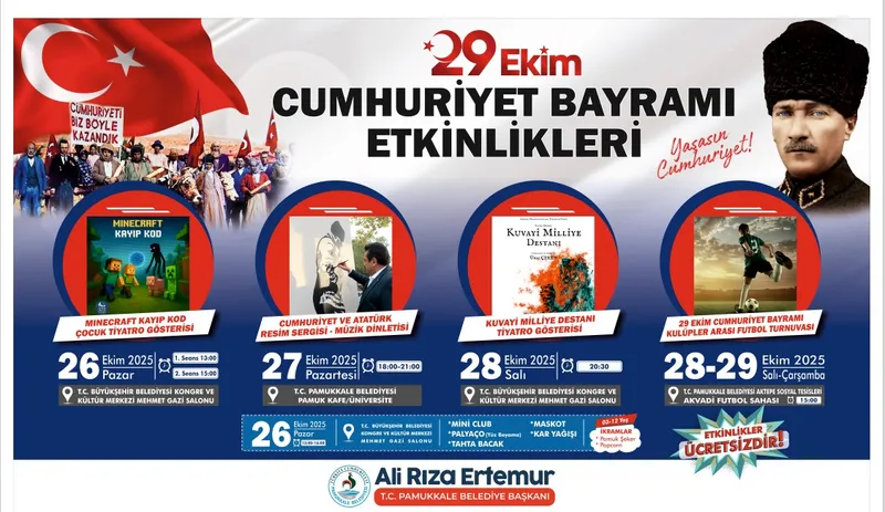 Pamukkale Belediyesi'nin 29 Ekim Cumhuriyet Bayramı etkinlikleri, 26 Ekim Pazar günü çocuklara yönelik programla başlayacak. Denizli Büyükşehir Belediyesi Kongre ve Kültür Merkezi Mehmet Gazi Salonu'nda "Minecraft Kayıp Kod" adlı tiyatro gösterisi 13.00 ve 15.00 saatlerinde iki seansta sahnelenecek. Aynı gün 13.00-16.00 saatleri arasında fuayede Mini Club, palyaço, yüz boyama, tahta bacak gösterileri ve maskotlar yer alacak. Katılımcılara pamuk şeker ve patlamış mısır ikram edilecek.