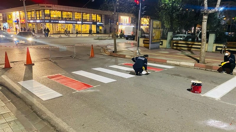 Trafik güvenliğini artırmak amacıyla gerçekleştirilen çalışmalar kapsamında, yıpranan ve solan yaya geçitleri yeniden boyanarak sürücü ve yayalar için daha görünür hale getiriliyor.