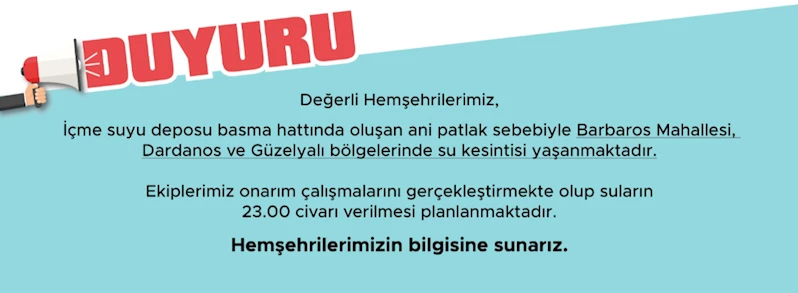İçme suyu deposu basma hattında oluşan ani patlak sebebiyle Barbaros Mahallesi, Dardanos ve