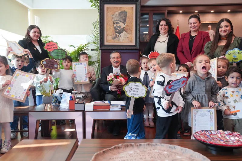 Tepebaşı Belediyesi Sabiha Gökçen Erken Çocukluk Oyun Merkezi öğrencileri, Dünya Çocuk Hakları Günü'nde Başkan Ataç'ı ziyaret ederek hazırladıkları pankartları gösterdi.